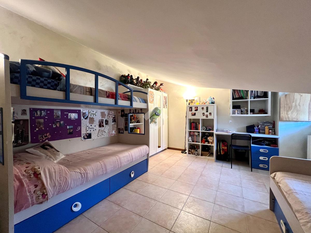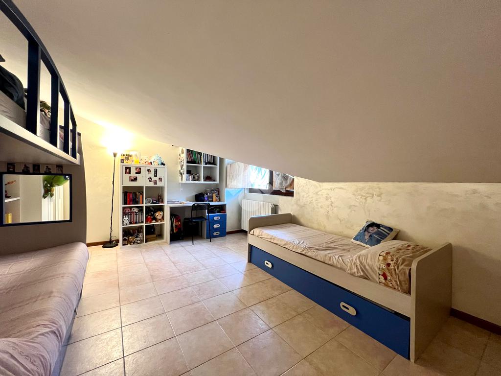 Una scala interna in muratura conduce al locale mansarda adibita a zona notte, composto da una spaziosa camera matrimoniale e due camerette confortevoli, perfette per una famiglia o da adibire a studio/stanza hobby. Sullo stesso piano è presente anche una pratica lavanderia che aggiunge comodità alla vita quotidiana.